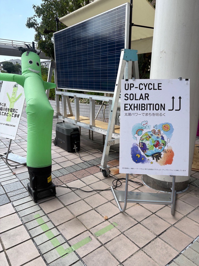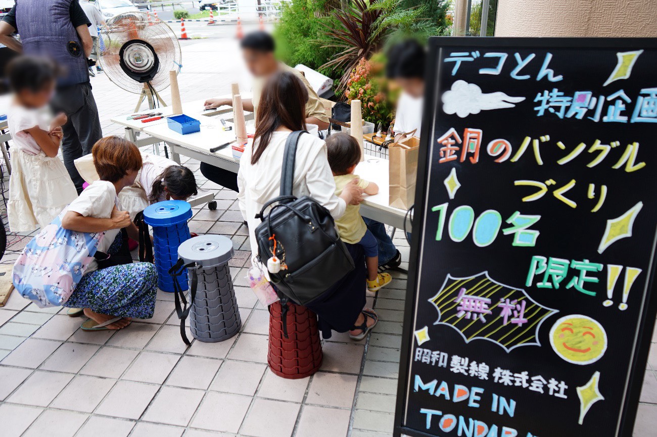 こども用品のおさがり会では、不要になったこども服やこども用品を当日に持参、必要な人が持ち帰る事で資源の有効活用とごみ発生の抑制を図った。また、会場では現在開催中の2025年大阪・関西万博でも展示されている太陽光パネルをアップサイクルしたベンチの展示や銅線のバングルづくり体験を実施した。