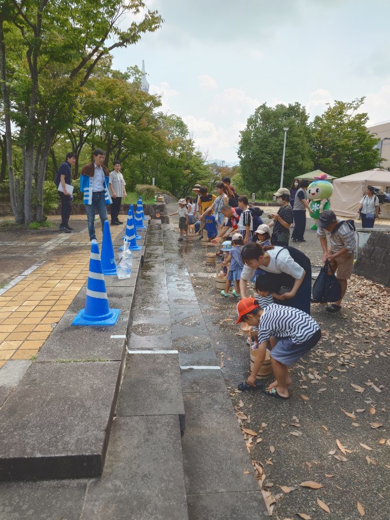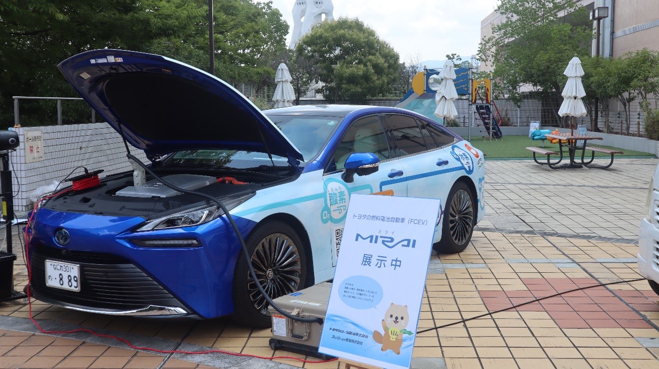 打ち水アート体験は、「水の日」の啓発及び昨今の地球温暖化による熱中症予防のPRの一環として実施し、多くの参加者が体験した。また、手回し発電で電車やレーシングカーを走らせることで電気を作る大切さを学ぶ機会となった。ほかにも環境に配慮した自動車の展示では、大阪府おおさか電動車協働普及サポートネット会員の協力のもと、FCVやEV、PHEV等のゼロエミッション車の展示や自動車の電源をキッチンカーや給水機、ミスト扇風機等の稼働へ利用した。